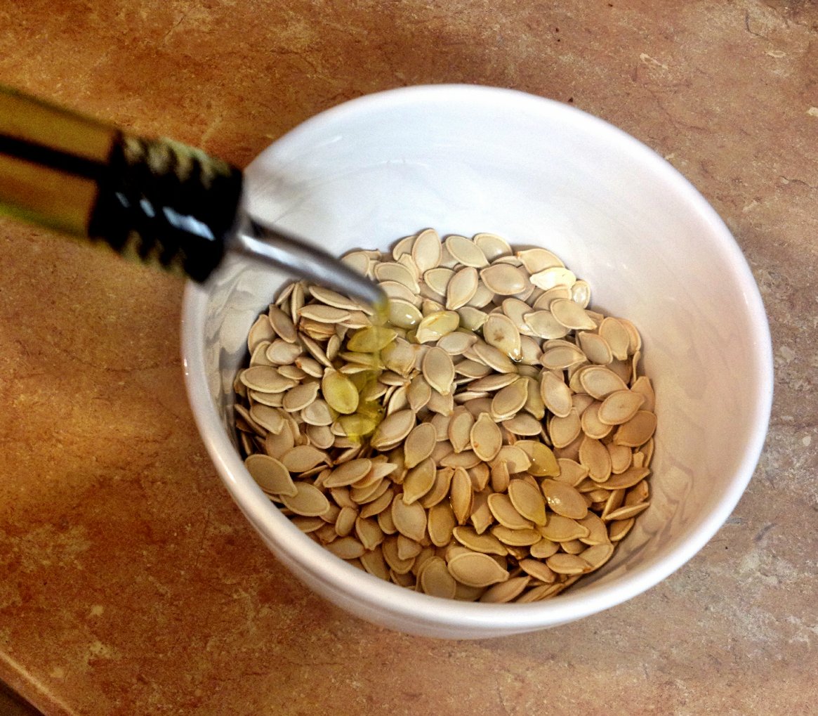 - In a bowl, add enough olive oil to coat your pumpkin seeds. Add in spices to your preference and mix to distribute. We love garlic and salt, so I’d say we used a small palm-full of each.