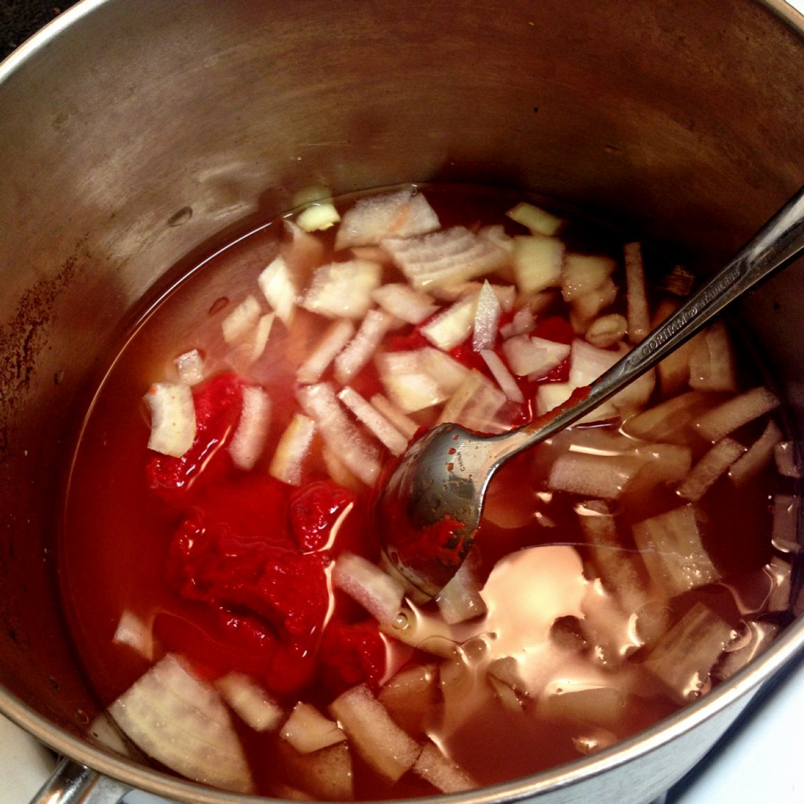 - Combine tomato paste, onion, garlic, sugar, and seasonings in pot and bring to a boil. Lower temperature to medium and let simmer for about 30 minutes until the onions are fully cooked.