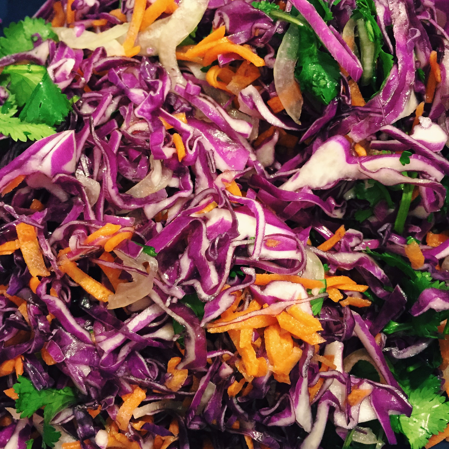 - Prepare the slaw by combining the cabbage, onion, and carrots in a food processor outfitted with a shredder plate. Stir in cilantro and a teaspoon of salt and allow it to strain while in the refrigerator. [It will need to sit awhile to get the juices out.]