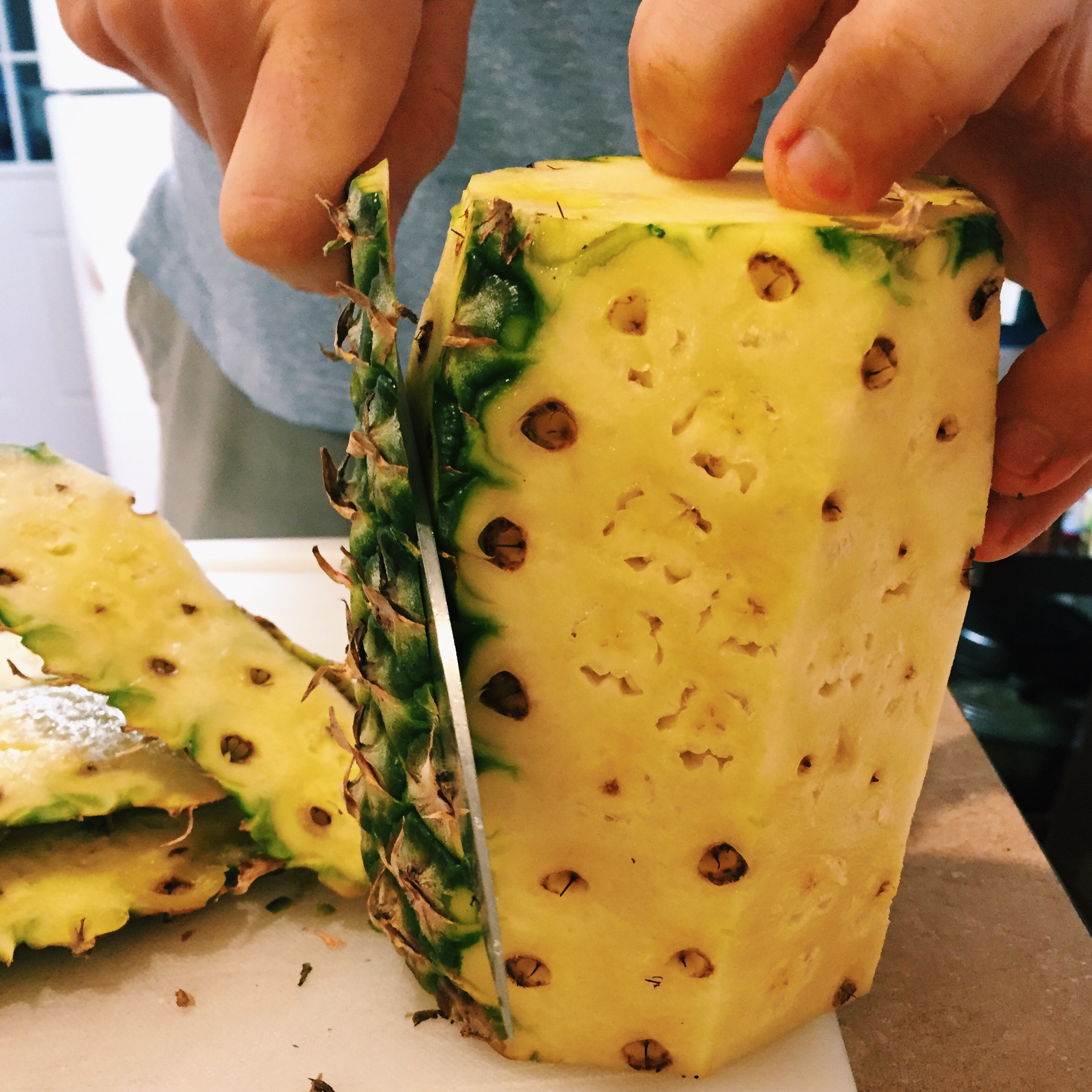 - Prepare the pineapple for the grill by cutting off the top and bottom of the fruit and slicing the tough outer skin, continuing around the pineapple until fully removed. Slice the pineapple lengthwise around the core to desired thickness.