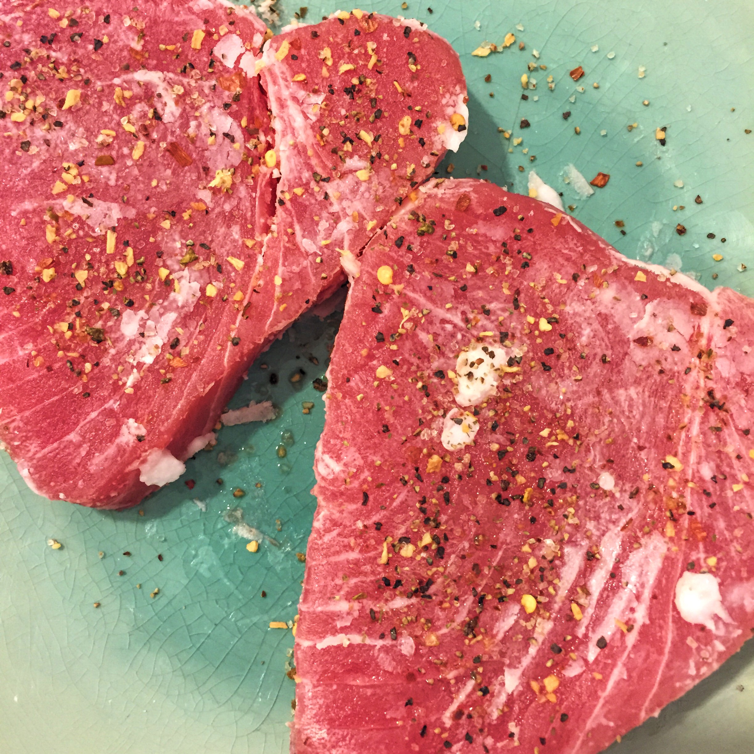 - Prepare the tuna steaks by rubbing the coconut oil on both sides – about 1 Tbs. per steak. Season with salt, pepper, sugar, and any other steak seasoning spices you like. [We used a combination of salt, pepper, garlic and onion powders, sugar, and parsley.]