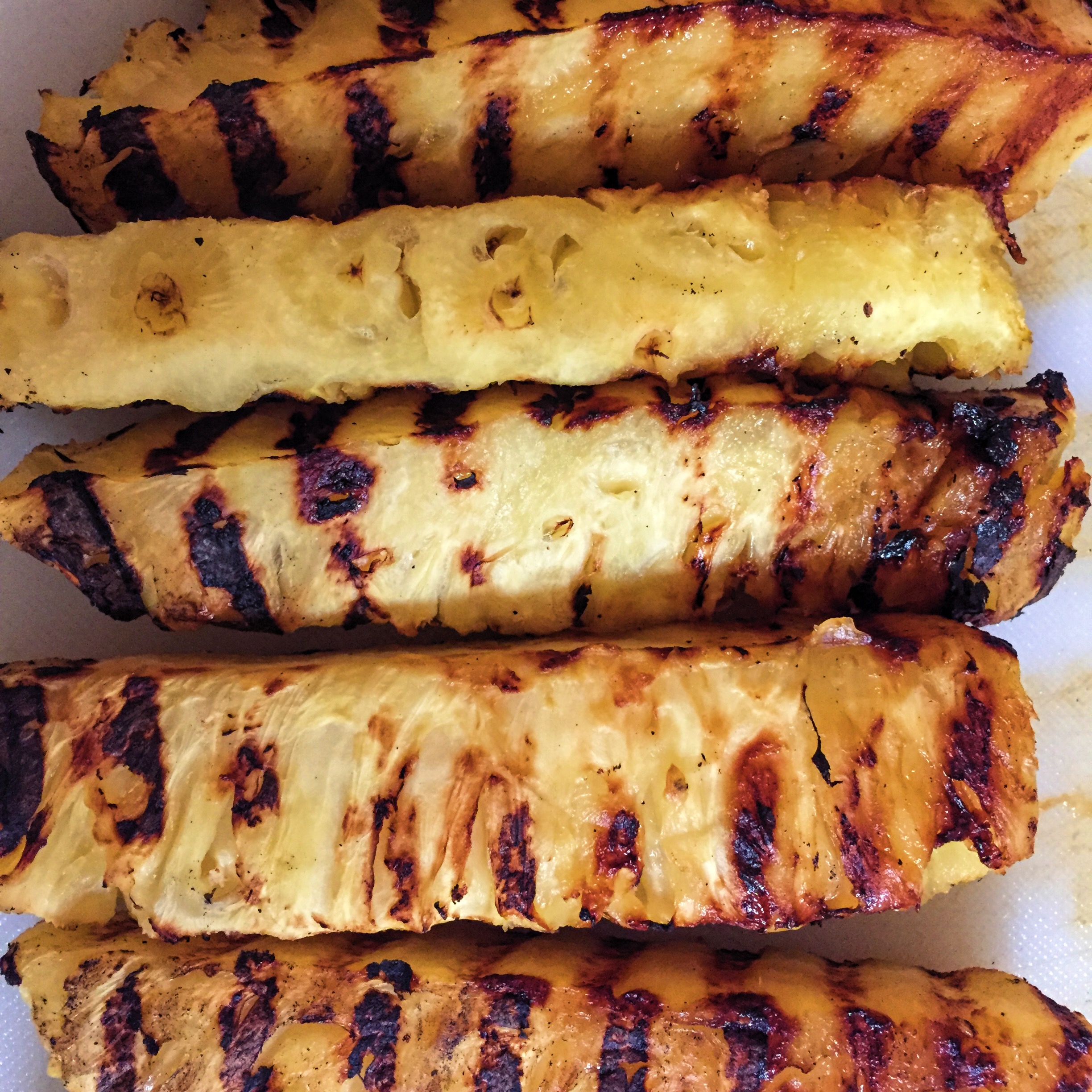 - Place pineapple on the grill. [Girlie note: place them on in a way that doesn’t allow them to fall through the grates!] Grill for about 20 minutes with the lid closed, turning every 5 minutes. Once it is nice and caramelized on all sides, remove from grill and chop into small chunks.