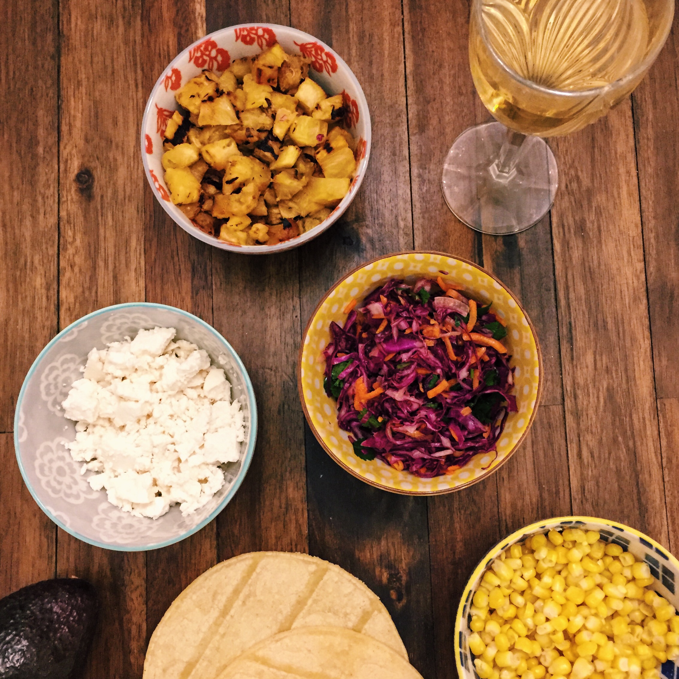 - Warm your tortillas and build your tacos with the tuna, slaw, pineapple, cheese, and sliced avocado!