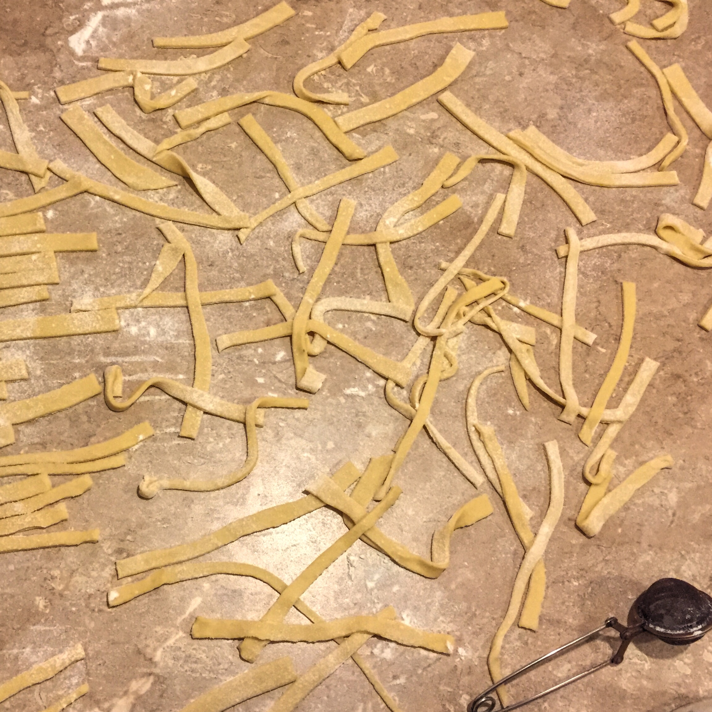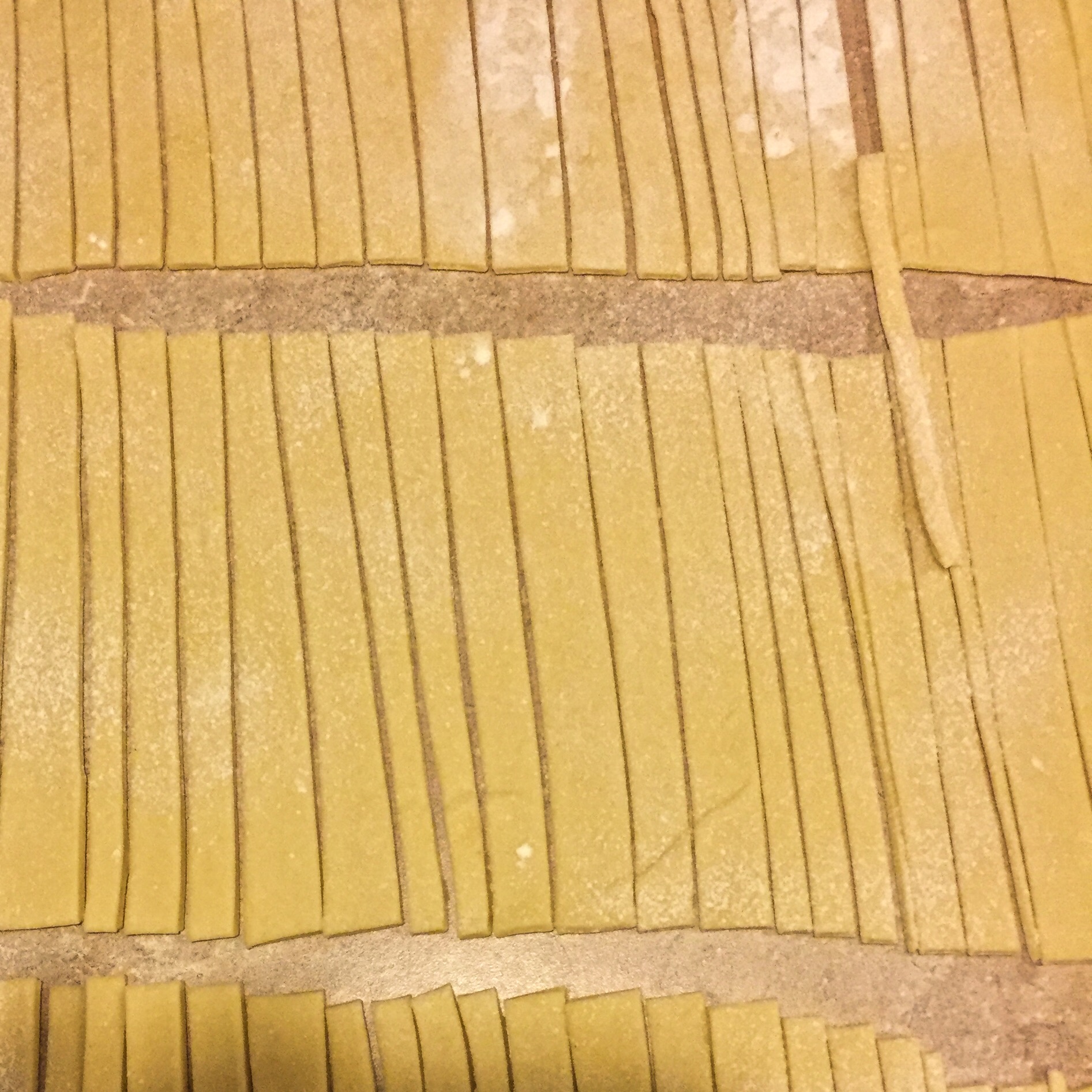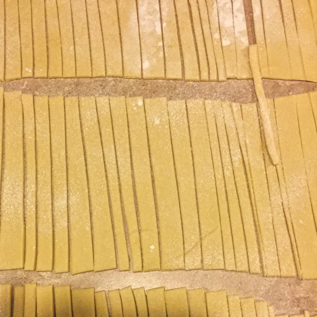 - With a large rolling pin, roll the pasta out until it’s about 1/16″ thick. Cut long strips 1/2″ wide, then cut those strips into 3″ pieces. Dust with a touch of extra flour, break up, and let dry at room temperature.