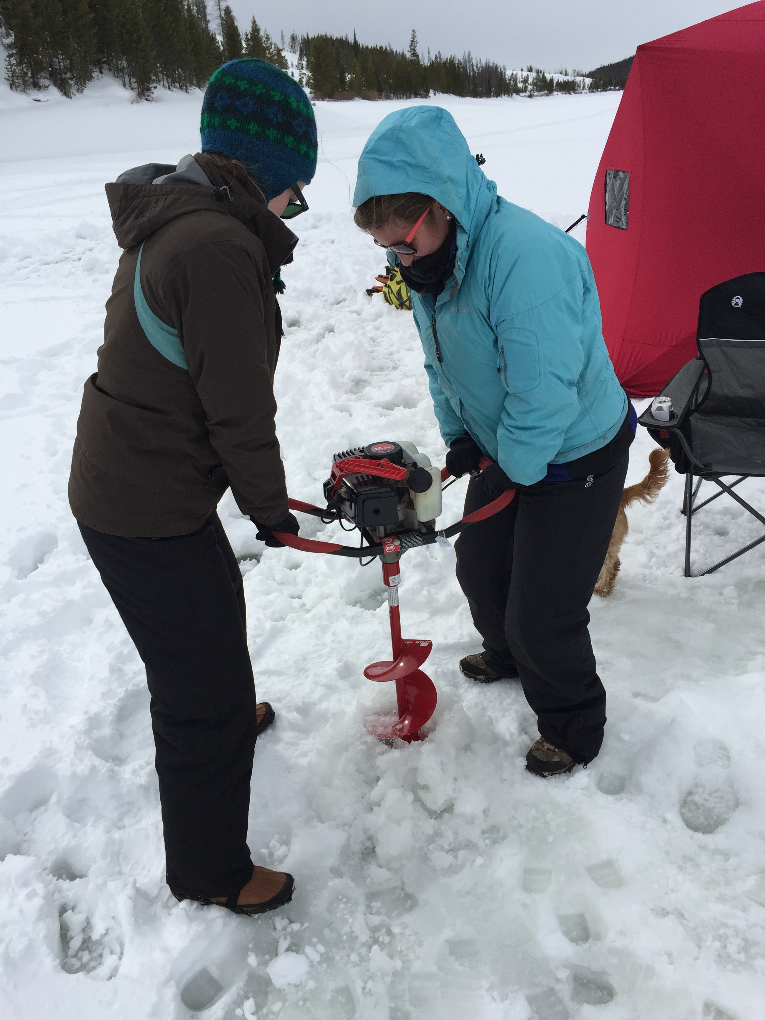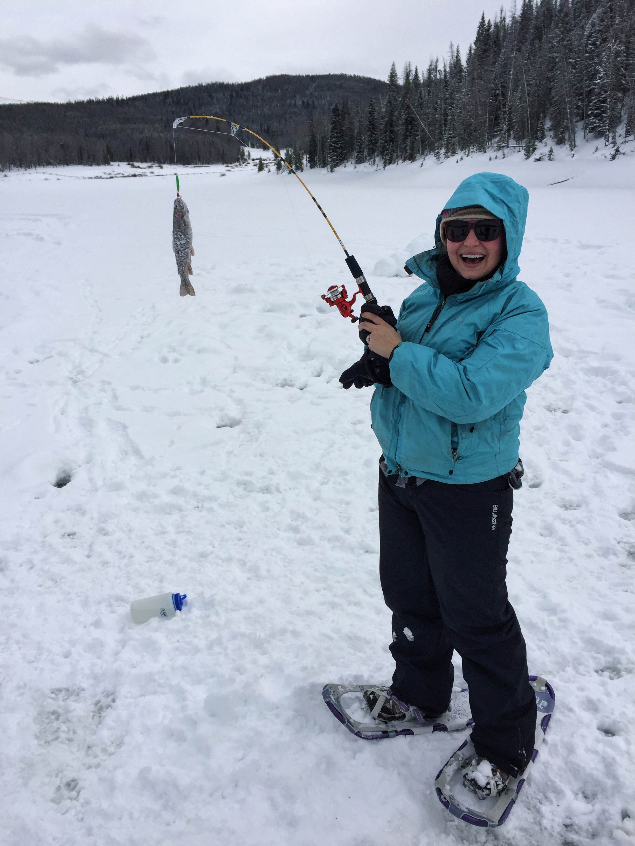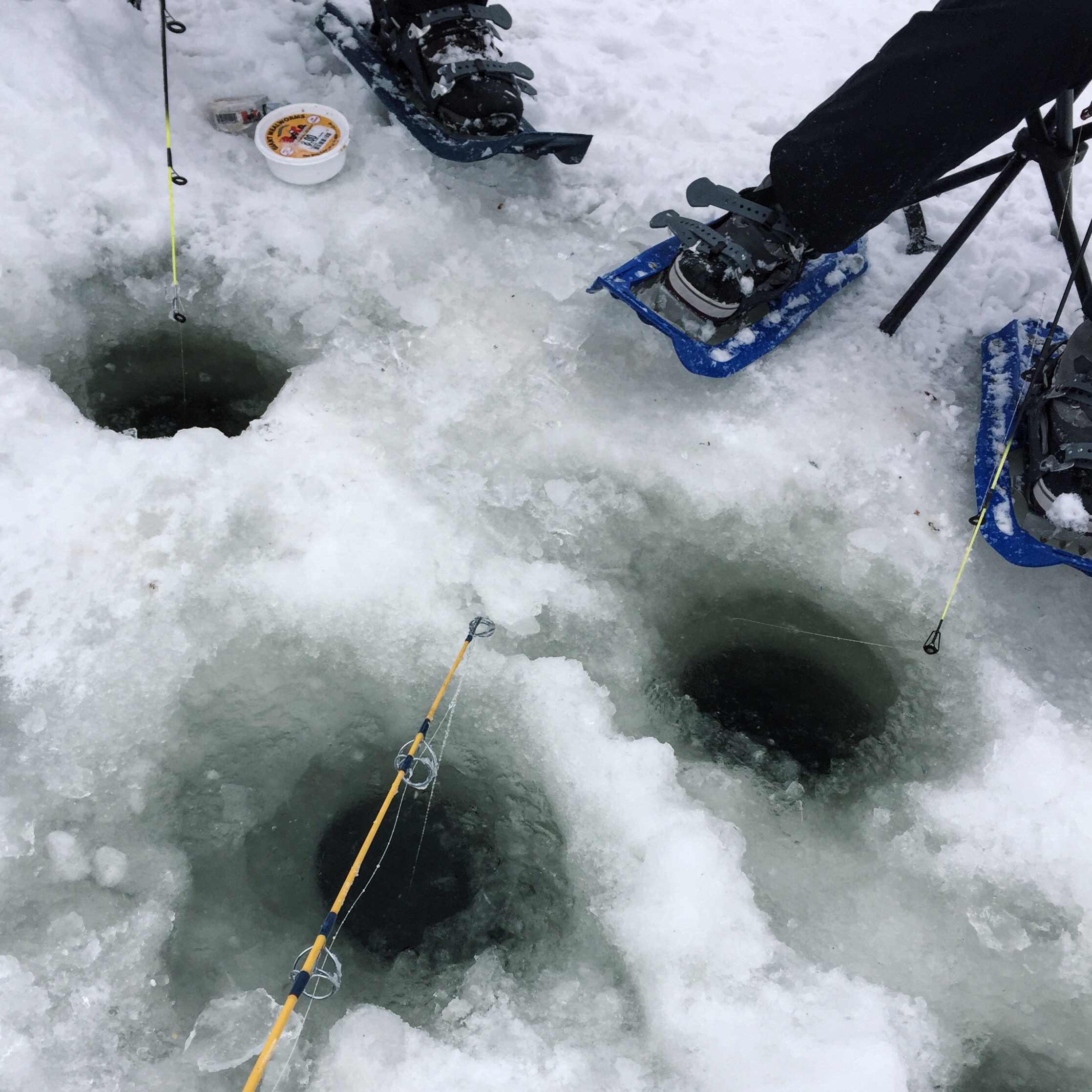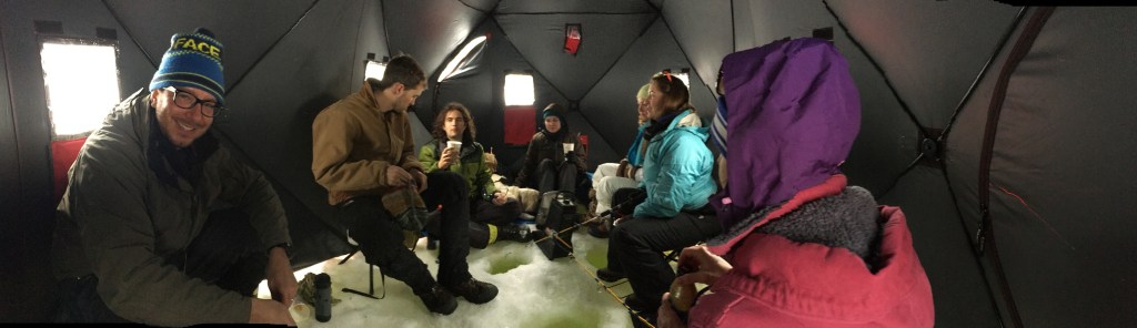 Then there was the actual act of ice fishing: stepping out onto the frozen lake for the first time was an at once electrifying and terrifying moment. But with the snowmobiles riding all around and a two-foot layer of ice between the water and us, we soon found there was nothing to fear. In fact, we found that there was everything to delight in: the warmth of the shanty sheltering us from the wind, dogs romping around excitedly in the snow, the thrill of yelling “FISH ON!” as soon as we landed a trout, the joyful power of drilling the auger through the ice, and the oncoming snowfall that lent itself to all sorts of snowball fights, snowshoeing treks, and snowmen building.