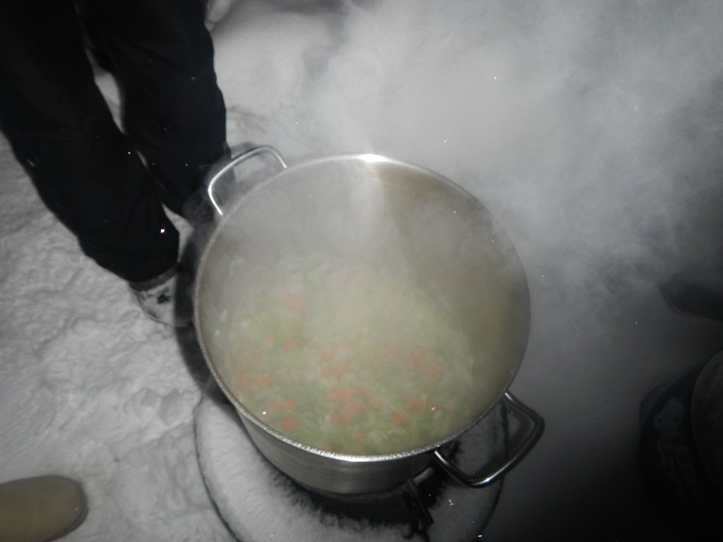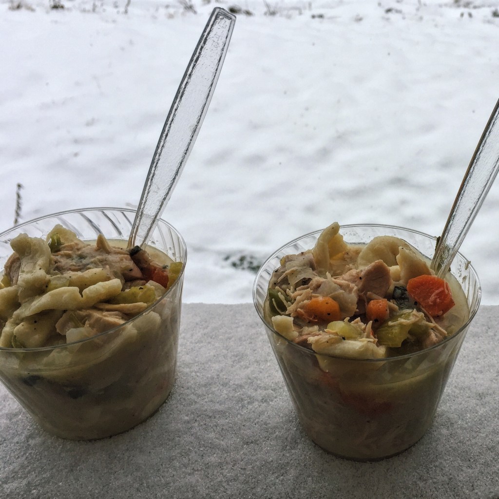 Jason saved the best meal for last: Homemade Chicken Noodle Soup. It sounds like an indulgent decision for a weekend in the land of no-cell-reception and no-running-water, but he was intent on having our main meal together be an easy yet warm remedy for a full day on the ice. And that it was. Served alongside heaps of homemade “Jason bread”, plates of olive oil and balsamic dipping sauce, and freshly grated Parmesan cheese, this soup is one that I am sure we will recreate again and again, whether in the mountains or at home.