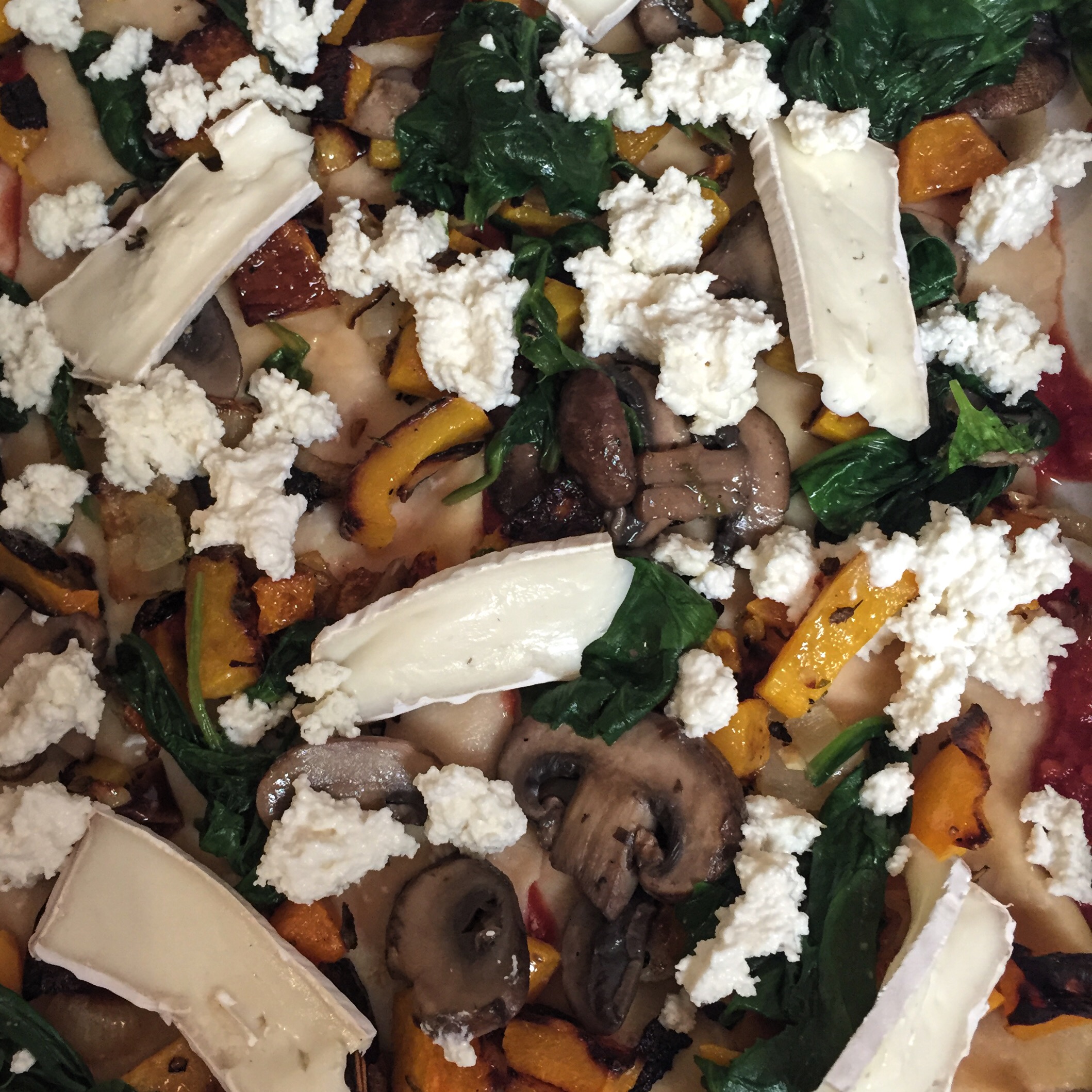 - Top with squash, mushrooms, brie, ricotta, and sauce and cover with more noodles. There won’t be any defined layers, just a Pollock-like pile of ingredients.