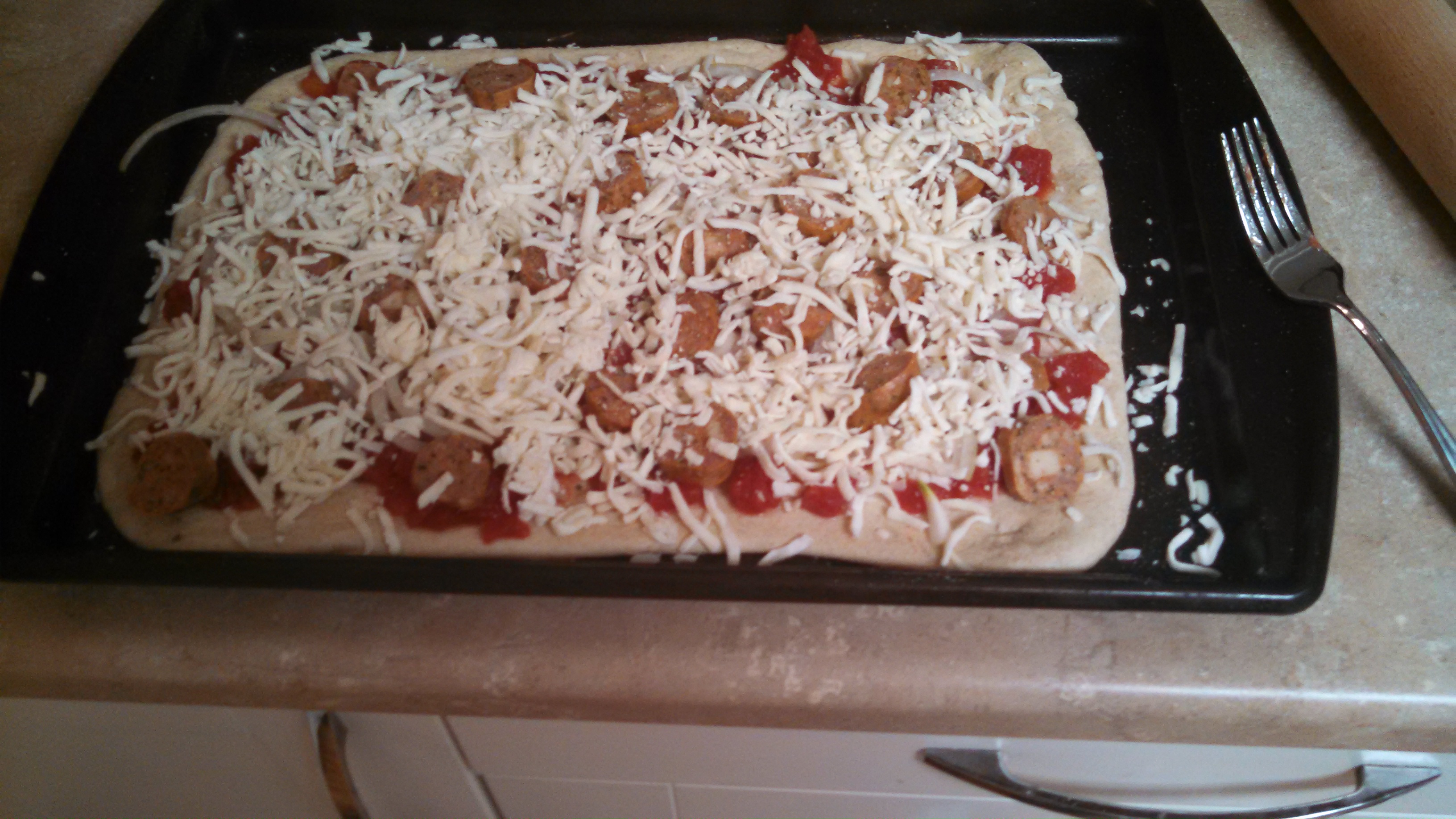 Have a photo of uncooked Good pizza. I forgot to take a photo of the finished product. Sorry. Fork Optional [I think I used it to spread the tomatoes around?].