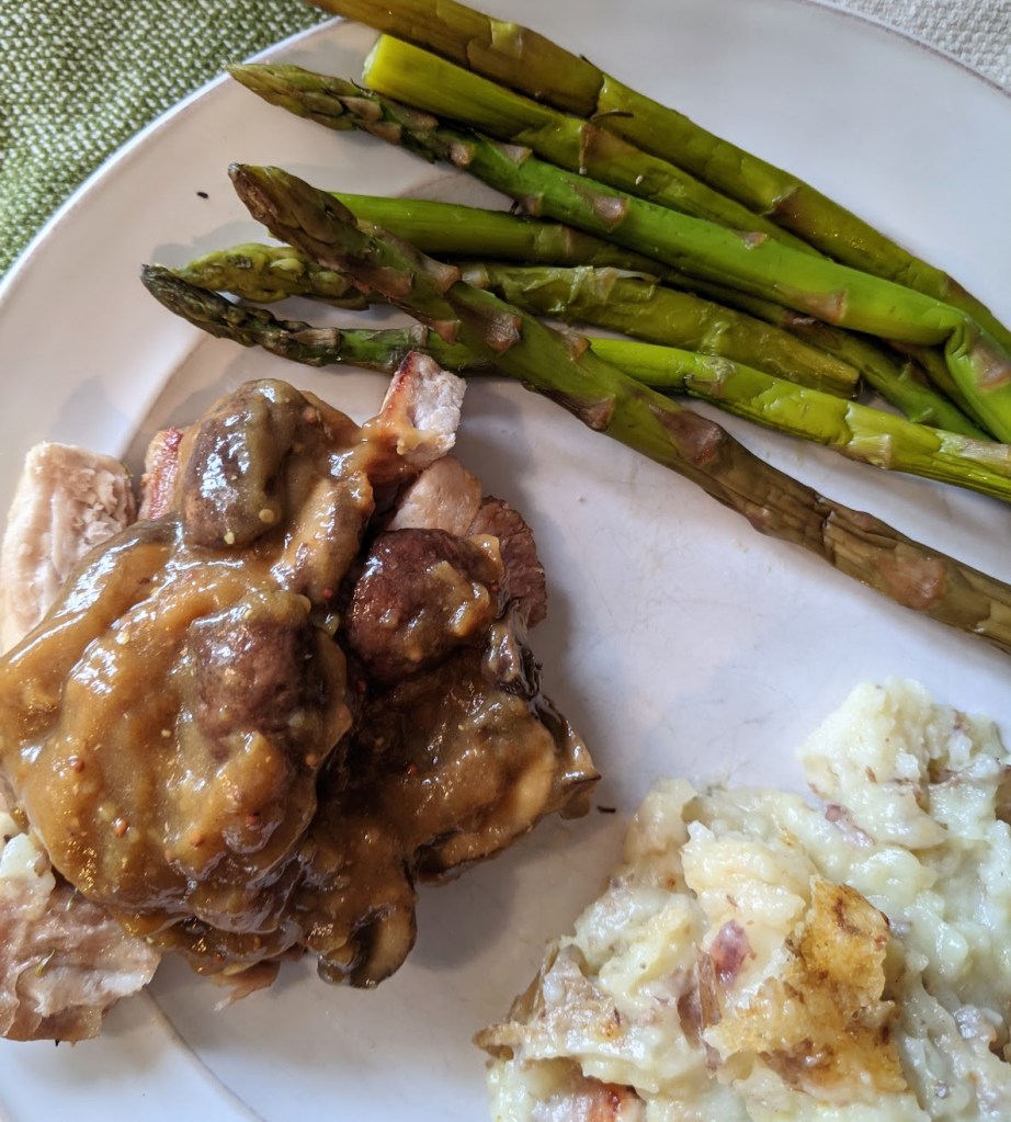 Thank goodness the meal is a kid-friendly home run: pork chops with asparagus and mashed potatoes served with a honey mustard mushroom sauce.